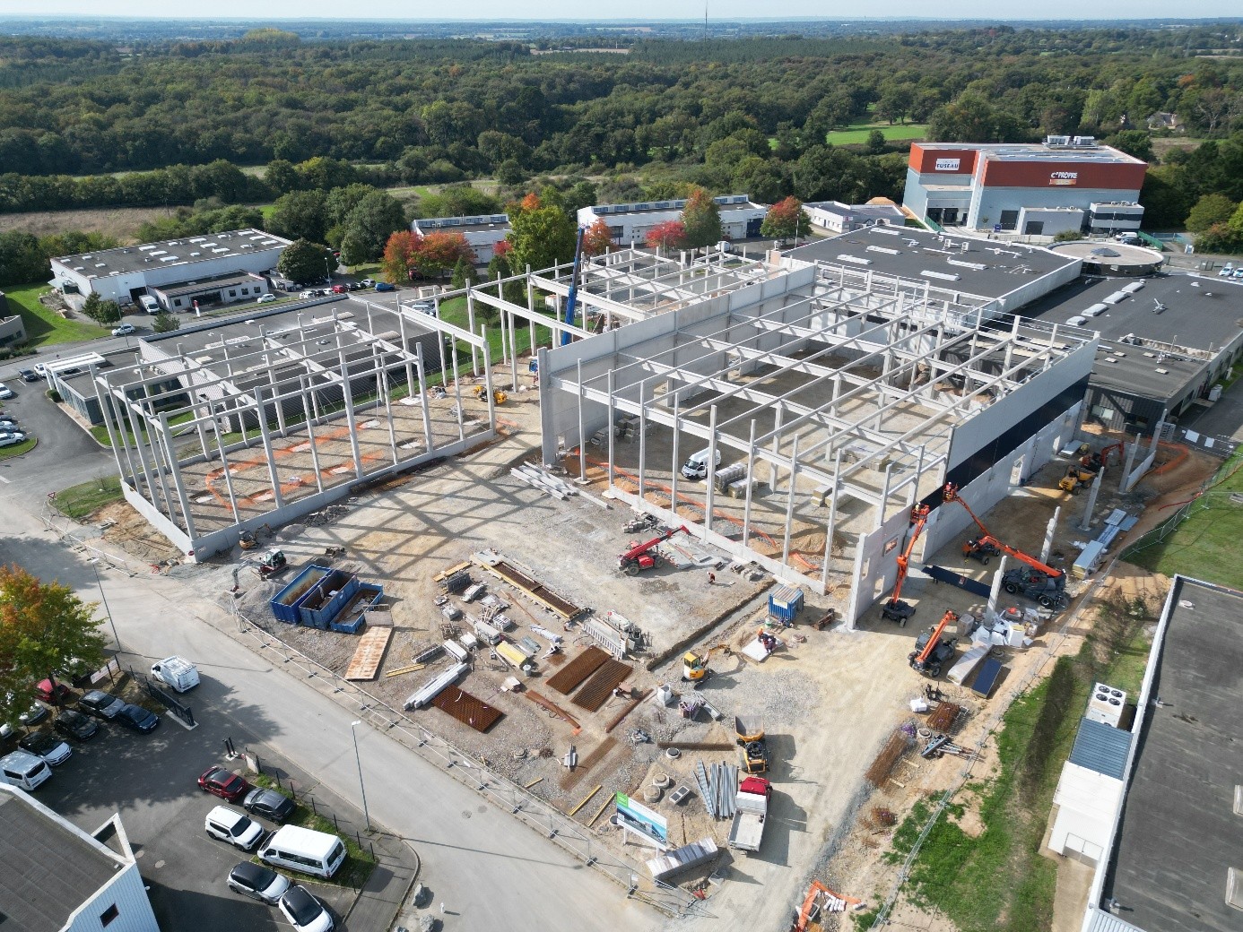 Les terrassements ont été achevés au deuxième trimestre 2025, et les travaux de préparation de la plateforme ainsi que l’assainissement du site sont en cours. La prochaine étape clé concernera la pose de la charpente et de la structure du bâtiment, suivie de la couverture et du bardage prévus pour le troisième trimestre 2025. Le chantier s’étendra sur environ 11 mois, avec une livraison finale prévue pour le premier trimestre 2026.